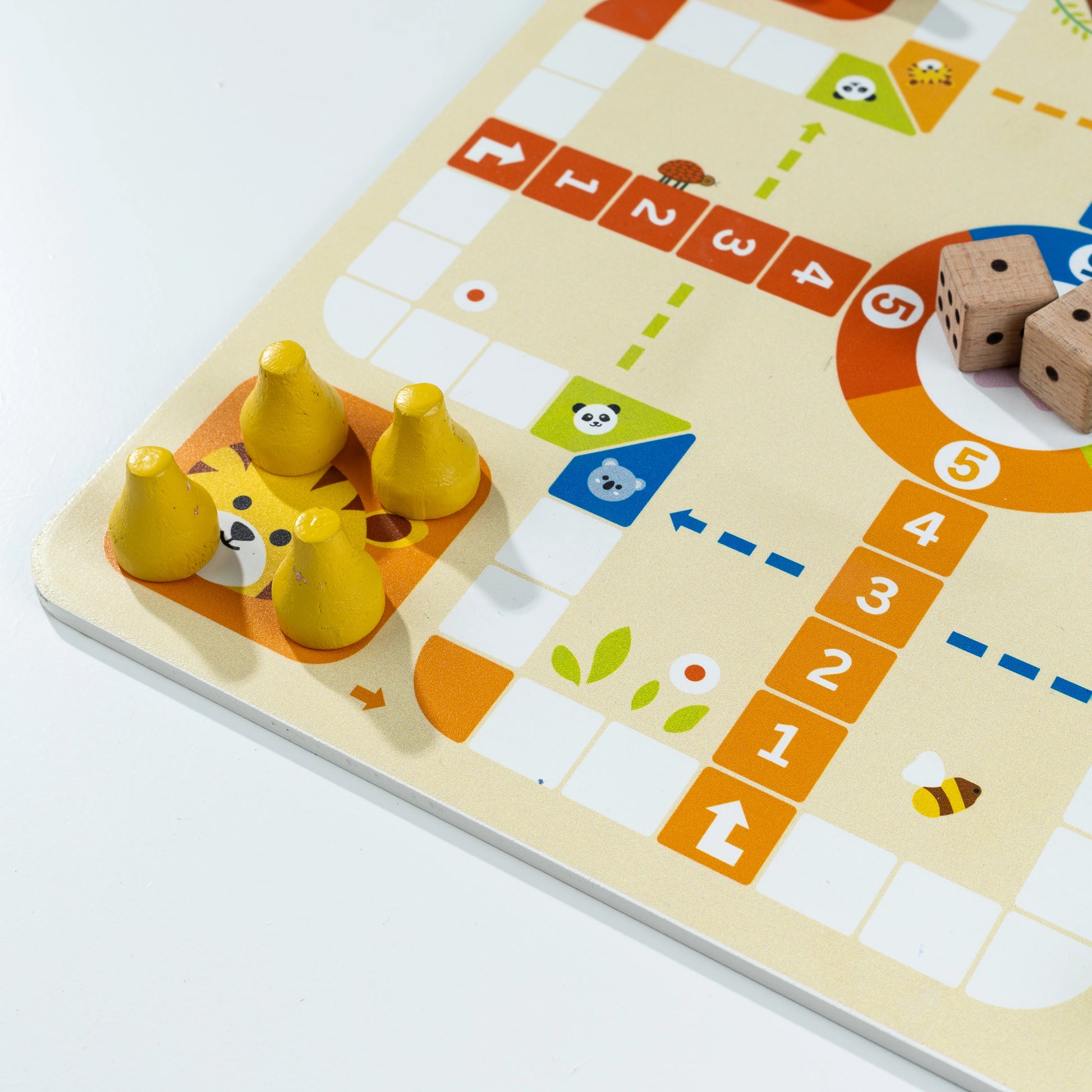 • Brightly painted game board and colourful tokens that draw attention and make play lively.